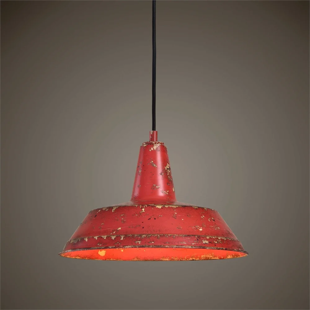 Rustic cord hung pendant with a brilliant heavily distressed poppy and tomato color finish with rust and cream undertones.